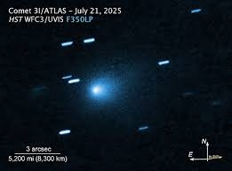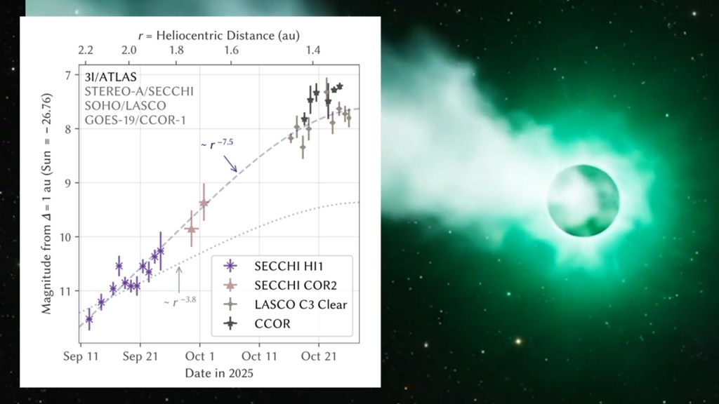 Grâce aux tĂ©lescopes imageurs solaires (coronagraphes SOHO C3 et GOES-19 CCOR-1), les astronomes ont pu observer 3I/ATLAS jusqu’au 26 octobre et constater une hausse spectaculaire de sa luminositĂ©, passant de 10,5 Ă environ 7,5, soit une multiplication par 16..