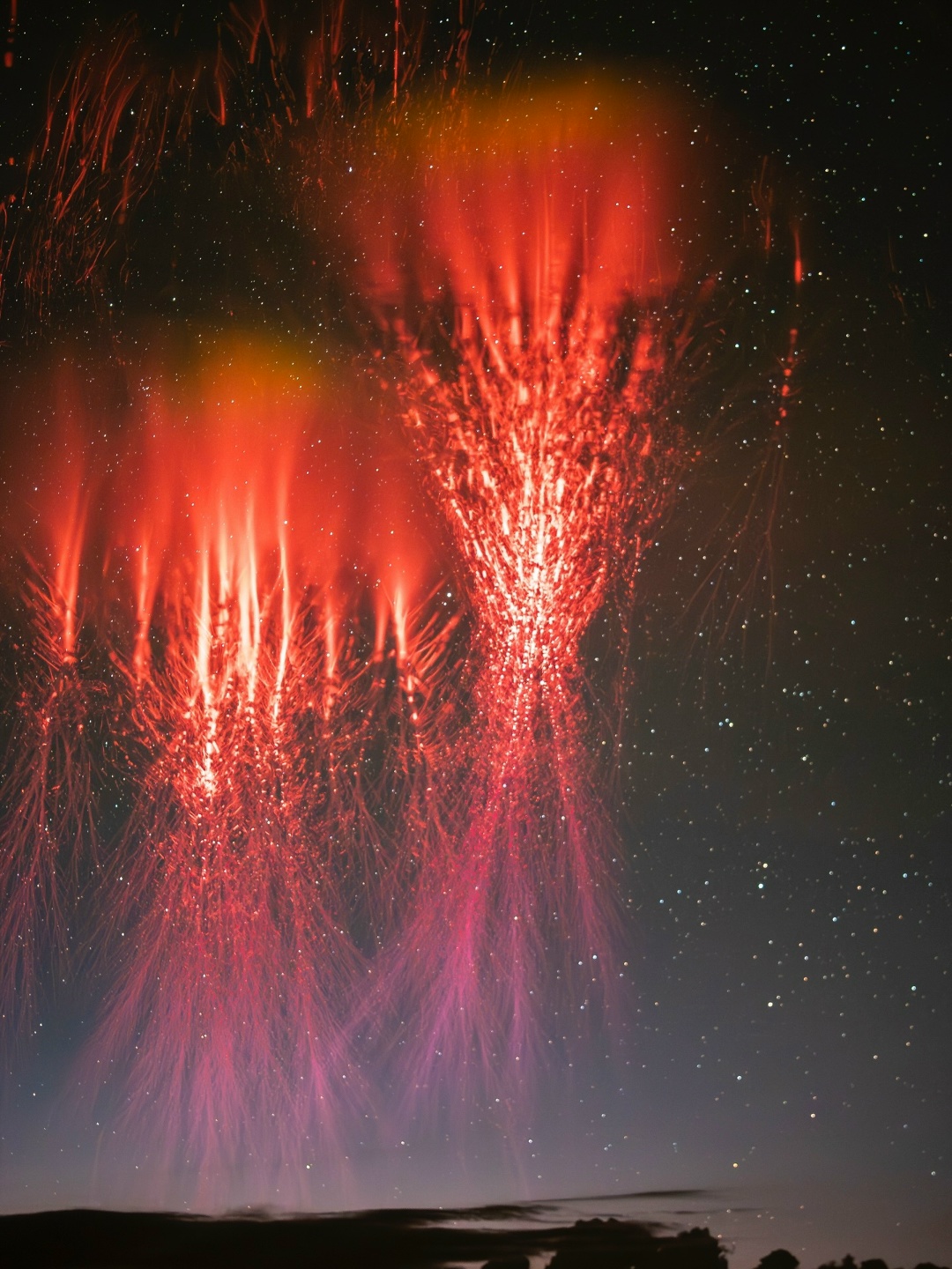 On peut les observer jusqu’à 100 kilomètres d’altitude environ… ces lueurs apparaissent dans la mésosphère et thermosphère lors d’éclairs puissants , en général au dessus des orages…. Décharges électriques lumineuses en haute atmosphère de courte durée. Elles présentent des filaments lumineux très fins où l’on observe une forte accélération des électrons, se sont des échanges énergétiques transitoires de rayons cosmiques de haute énergie, de sursauts gamma, de phénomènes atmosphériques entre les couches atmosphériques..
