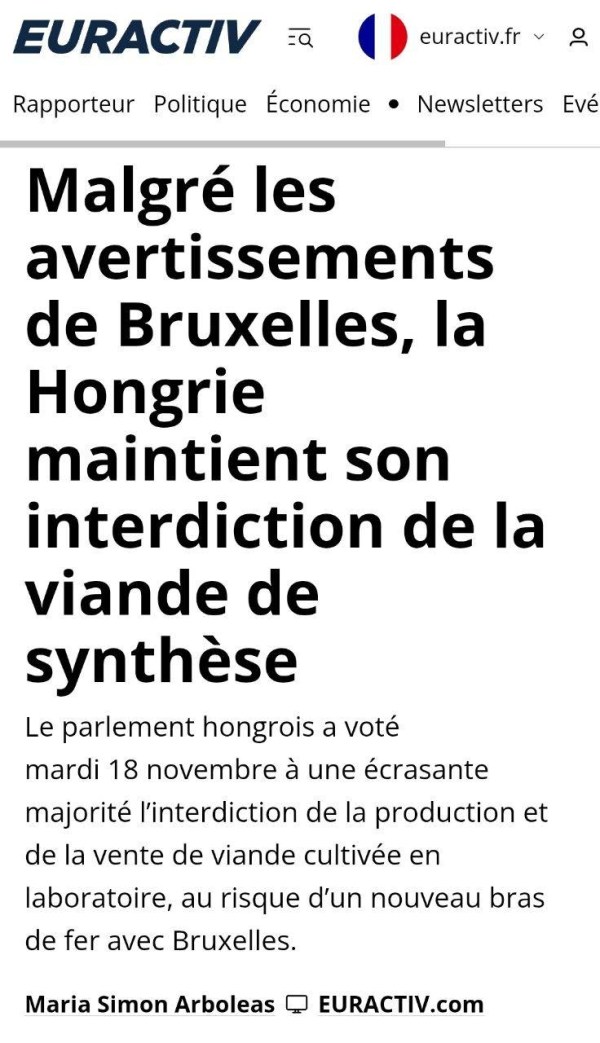 L’Italie avait interdit par une loi la viande de synthèse :Cette loi italienne a été annulée par Bruxelles ! 😃😳🙃⚡Elle n’est donc pas applicable. La Hongrie tente la même chose que l’Italie : l’UE vient de la menacer de la traîner devant les tribunaux !« Une telle interdiction menacerait la libre circulation des marchandises dans... Lire la Suite →