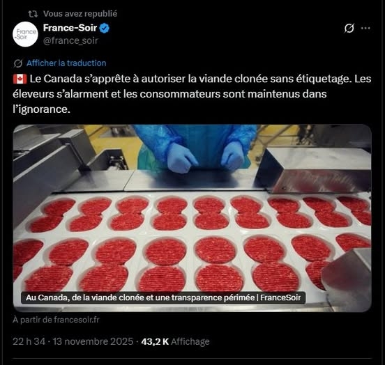 🚨🚨 Le Canada s’apprête à autoriser la viande clonée sans étiquetage. Les éleveurs s’alarment et les consommateurs sont maintenus dans l'ignorance.🚨Pareil avec le Brésil et le Mercosur , par contre là , c'est plus subtil seul les veaux des vaches clonées sont autorisés à la vente , les vaches sont enfermées dans des étables à... Lire la Suite →