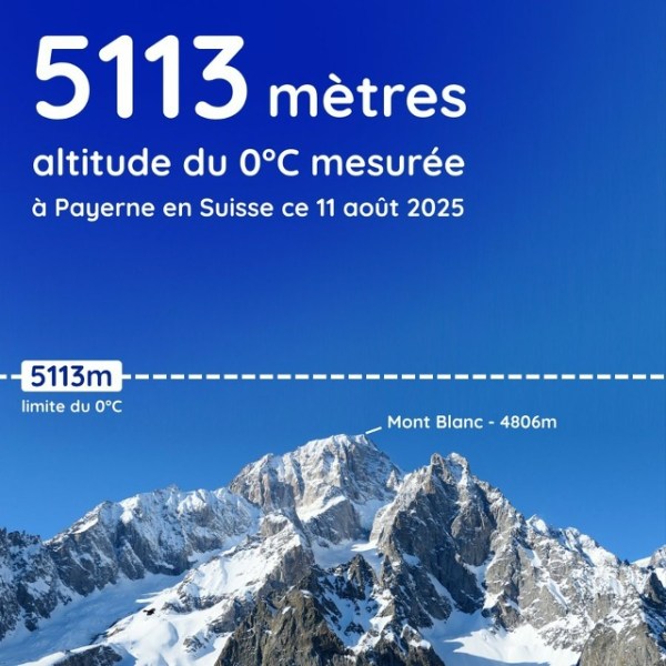 Cela signifie que la température était positive jusqu'au sommet du Mont Blanc ! Ces données sont obtenues en lâchant un ballon sonde.En pleine canicule, la chaleur gagne aussi les sommets : il faut grimper à 5000 m pour trouver 0°C, bien au-dessus du Mont-Blanc (4806 m) 😮Un niveau exceptionnel qui accélère la fonte des glaciers.