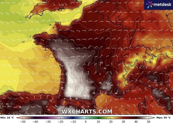 🚨🚨🔥😃⚡☺ Indice de chaleur totalement absurde jusqu'à 50°C possible juste autour de Bordeaux, France le lundi 11 août.🚨À suivre, car il est annoncé 42° sur bordeaux aujourd'hui, à voir ce soir dans les localités autour..