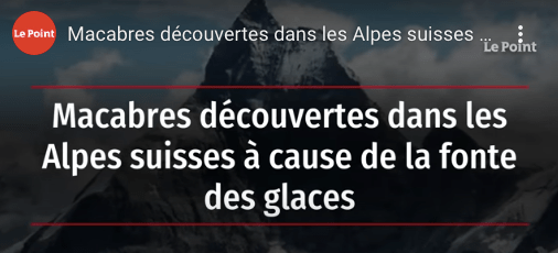 Plusieurs découvertes dans les Alpes Suisse après la fonte importante des glaciers due aux vagues de chaleur....Tout remonte et va remonter , tout ce qui a été enfoui , caché ..à tout les niveaux.. Vidéo ici : https://youtu.be/cPexkg4B7Yk