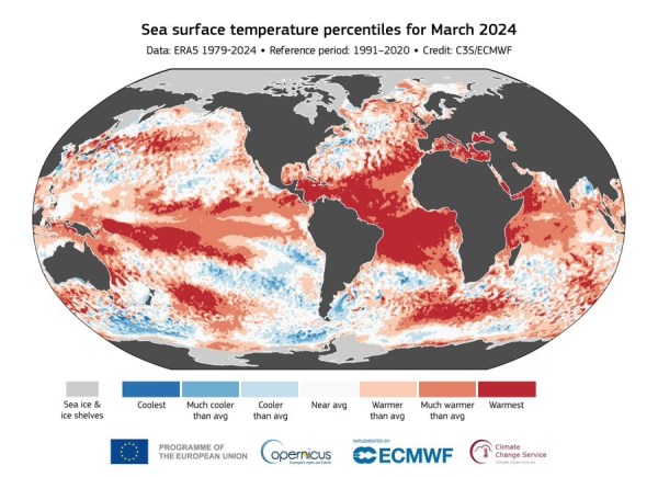 les records tombent les uns après les autres, et Cela à tout les niveaux..La température de l'eau à la surface des océans a battu un nouveau record en mars 2024 avec une moyenne de 21,07°C sur Terre, devançant le record de 21,06°C déjà établi en février 2024.