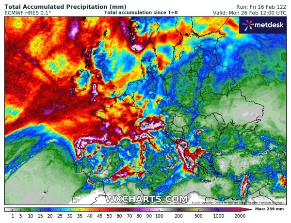 Une modélisation en cours, pour le 25 et les jours suivant, en espérant que Cela ne se passe pas ainsi..!! Le seul pays européen le plus arrosé pour les 15 jours à venir, selon ce modèle, c'est la France..il est même question de plus de 300 litres au Mètre carrée dans les Pyrénées.