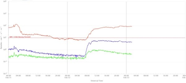 Une tempête de protons se termine, et une autre commence ! L'événement protonique que nous avons eu hier suite aux éruptions X et M s'est terminé tôt ce matin mais un autre événement nous a frappé vers 8 TU.
