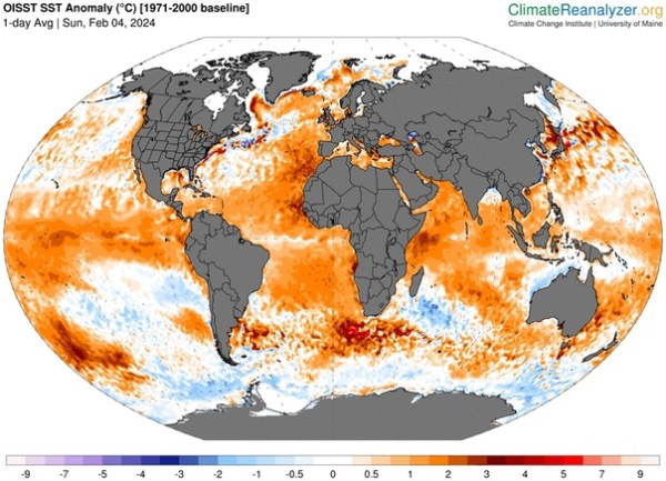 En ce début février 2024, la température moyenne des océans sur Terre atteint des niveaux records. Cette carte montre que la majeure partie des eaux du globe sont actuellement plus chaudes que la normale. Les océans de la Terre ont établi le 1.2/2024 un nouveau record de température de surface à 21,10°C. Le précédent record... Lire la Suite →