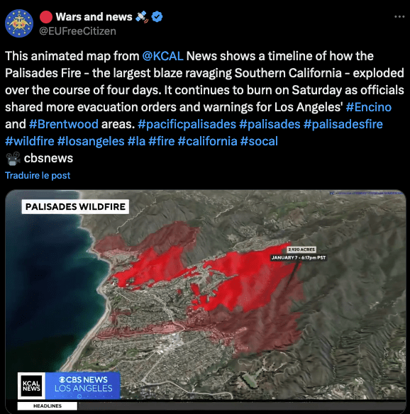 La Californie..Cette carte animée montre une chronologie de l'explosion de l'incendie de Palisades - le plus grand incendie qui ravage le sud de la Californie - au cours de quatre jours. Ça continue de brûler samedi alors que les fonctionnaires ont partagé plus d'ordres d'évacuation et d'avertissements pour les zones d'Encino et de Brentwood Il... Lire la Suite →