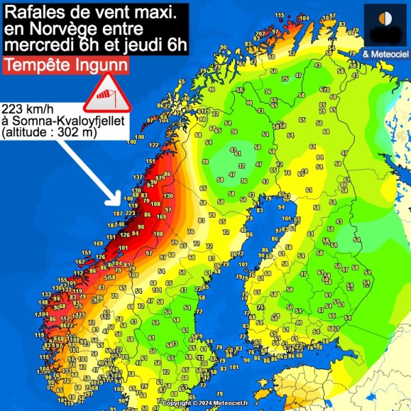 La Tempête Ingunn a frappé les côtes norvégiennes de l'Ouest et du Sud-ouest avec des rafales de 130 à 180 km/h, localement 223 km/h à Somna-Kvaloyfjellet (altitude : 302 m).