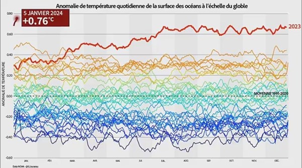 5.1/2024 L'anomalie de la température de surface des océans atteint des niveaux RECORDS jamais vus auparavant, avec +0,76 °C... Ce sont typiquement des valeurs enregistrées au plus haut de l'année record 2023, au beau milieu de l'été dans l'hémisphère nord.