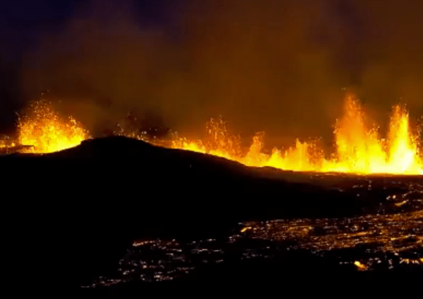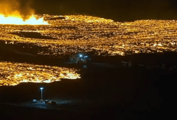 Une vidéo des équipes travaillant pour retirer la machinerie lourde utilisée pour construire le mur de défense, alors qu'elles étaient presque entourées de lave. L’éruption de la fissure a traversée le mur de défense qui a été construit. La lave émerge des deux côtés, avec le flux vers la droite se déplaçant vers le sud... Lire la Suite →