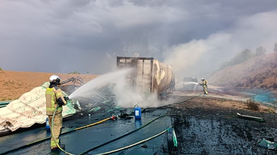 Suite à d'un accident entre un camion et une fourgonnette,un incendie phénoménal et rampant sur l'A-23 (autoroute mudéjar) s'est produit près de Cariñena, Saragosse en Espagne. https://vk.com/video647796984_456246719 https://vk.com/video647796984_456246720