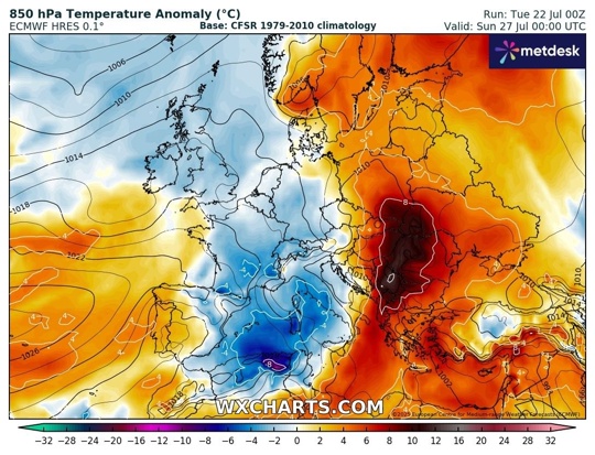 🚨🚨 Les masses d'air vont se rafraichir sur l'Europe de l'ouest, en commençant par la France qui retrouve des anomalies négatives. Cet air océanique chassera même l'actuelle canicule qui règne en Grèce et sur les Balkans. https://vk.com/video647796984_456246755