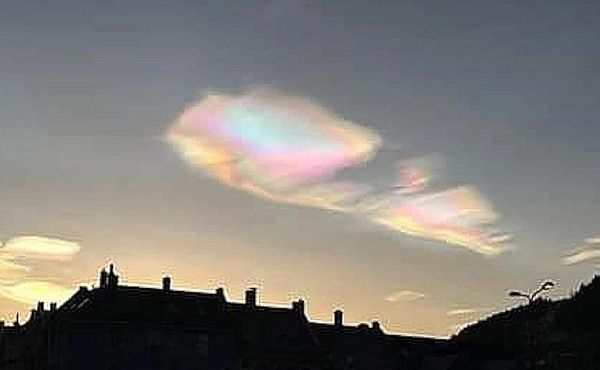 On voit bien le train d'ondes (les nuages irisés "hachurés" par des fréquences), on voit la précipitation dans ce monde, de ce qui est invisible, c'est une projection de lumière, d'un vaisseau Plasma en particules minérales Adamantines..