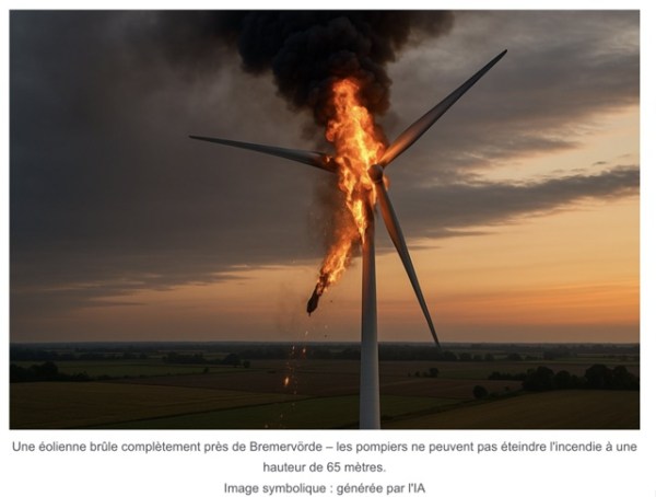Un incendie s'est déclaré à Bremervörde-Iselersheim en Allemagne, le 15 mai 2025 sur une éolienne à une hauteur d'environ 65 mètres.Les pompiers sont restés impuissants n'ayant aucun moyen d'éteindre cet incendie.il parait que c'est de l'énergie propre.😉😂 ( à base d'électricité bien sur !! )