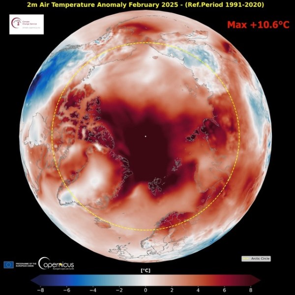 La température a dépassé la moyenne presque partout dans l' Arctique , avec une anomalie maximale de +10,6 °C en février 2025 selon les données ERA5. L'anomalie journalière a même atteint +20 °C dans certaines zones, ce qui a entraîné une banquise à son plus bas niveau en février……..