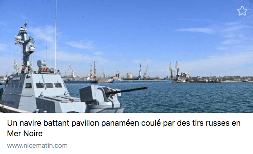 La marine de guerre russe" interdit à 200 à 300 navires de différentes nations de "sortir de la Mer Noire"L'un de ces navires "a coulé, et deux se maintiennent à flot mais ont subi des dégâts matériels", https://www.nicematin.com/conflits/un-navire-battant-pavillon-panameen-coule-par-des-tirs-russes-en-mer-noire-753798