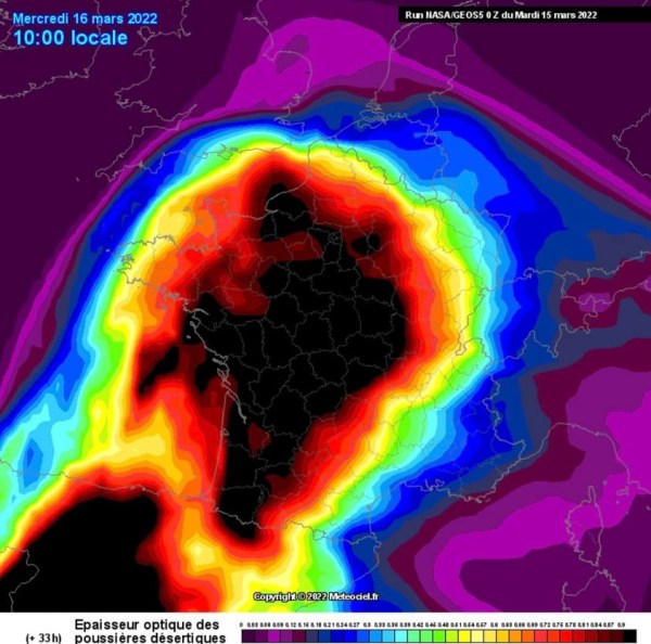 15 Mars 2022 Allemagne..Sable du Sahara..Depuis ce week-end et jusqu’en fin de semaine, les poussières de sable du Sahara transportées par les vents recouvrent toute la France. Elles génèrent des ambiances féeriques, mais sont sujet d’inquiétude. Pollution, santé, changements météo… L’intensité de l’épisode de circulation (troisième depuis le début de l’année) des poussières de sable... Lire la Suite →