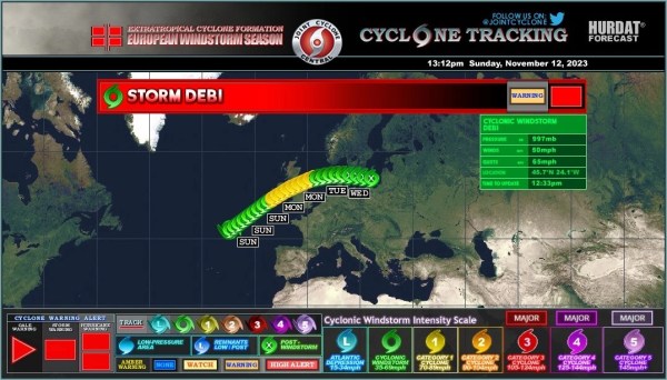 🚨🚨⚡ Alerte rouge déclenchée par la météo irlandaisela tempête Debi s'apprête à traverser les Îles Britanniquesce lundi. Jusqu'à 120/130 km/h prévus dans les terres, et 140 km/h le long des côtes. Simple coup de vent pour le Nord français 🇫🇷.