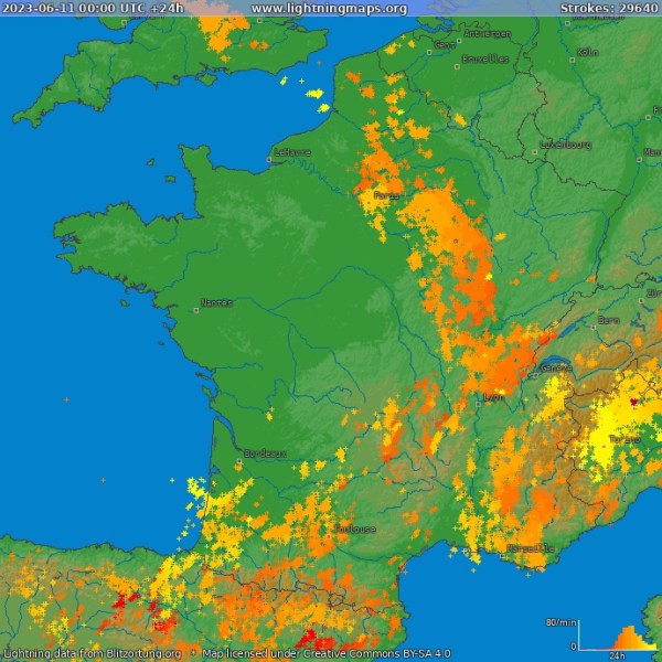 Activité électrique intense et orages de plus en plus violents( pluies diluviennes , bourrasques et grêle ) Près de 20.000 décharges de foudre ont été enregistrées sur le territoire français hier dimanche 11 juin 2023. Carte 2 Nouvelles menaces orageuse pour aujourd'hui..