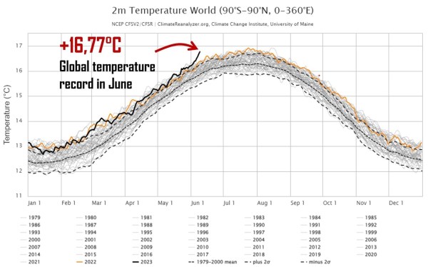 Hier 10 Juin 2023la température moyenne mondiale a atteint +16.77°C.Il n'avait jamais fait aussi chaud sur Terre en juin depuis le début des relevés. Cette valeur s'approche même du record absolu planétaire : 16.92°C de juillet 2022