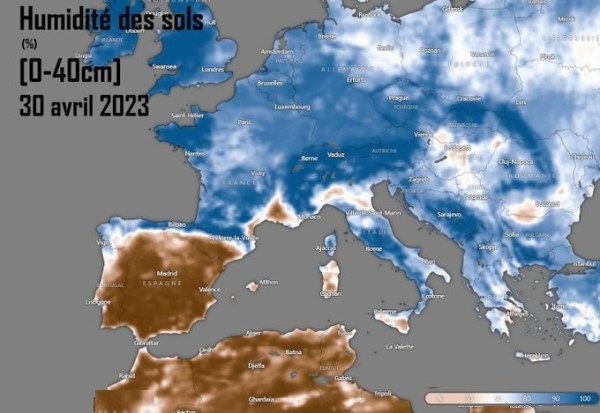 AU 30.4/2023 Humidité des sols ..L' été n'a pas commencé , donc Très chaud !! voir extrême , pour l'Espagne , le Portugal , l'Afrique du Nord , la Sardaigne , la Sicile et la région Méditerranée ( Paca et Languedoc /Roussillon )...