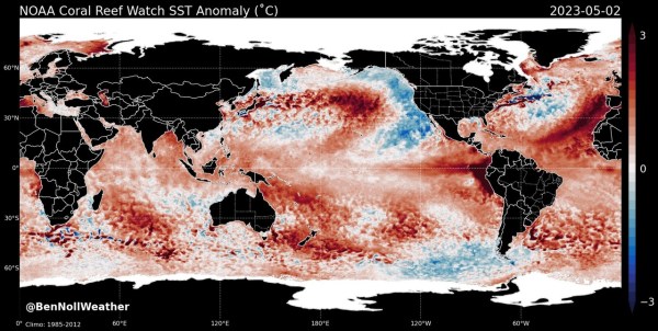 La température des océans en augmentation , avec le retour du phénomène El Nino avec une anomalie de +0,42°C dans le centre Pacifique . Le pic de l'événement est pour le moment prévu en début d'automne prochain. le monde doit se préparer à des températures records,L’Organisation météorologique mondiale estime à 60 % les chances qu’El Niño... Lire la Suite →
