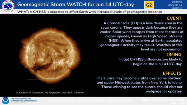 🚨🚨🔥⚡☀ Tempête géomagnétique de type G2 (modérée) a été émise pour le 14 juin 2025 (UTC) en raison de l'arrivée d'un courant à grande vitesse de type trou coronal
