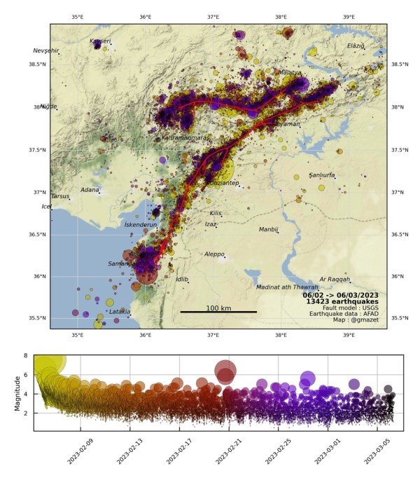 6.3/2023Plus de 13 000 répliques enregistrées en un mois après le double séisme de Turquie ..L'activité des répliques reste élevée avec un taux de 300-400 tremblements par jour.
