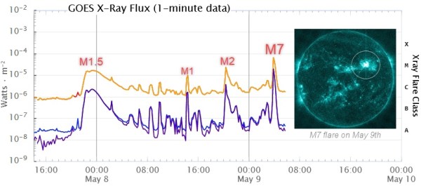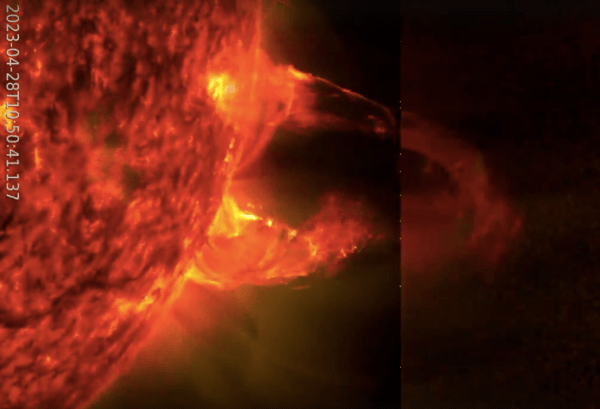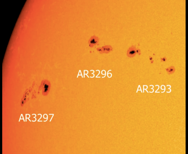 Activité solaire 4 mai 2023. Vidéo : https://vk.com/video647796984_456243521 Le quadrant solaire nord-est montre trois régions de taches solaires actives. On peut voir que la région AR3296 ( au milieu ) montre une polarité inversée par rapport aux deux autres..Le 3 et le 4 Mai des éruptions de classe M ont été observés AR3293 (le 3... Lire la Suite →