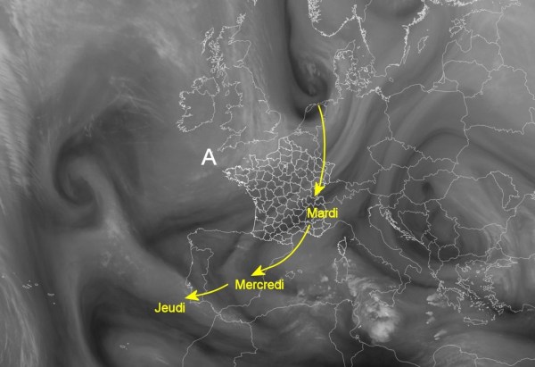 On vient d'assister à l'œuvre d'une goutte froide sur l'Espagne..La goutte froide qui contourne la cellule anticyclonique est positionnée en mer du Nord ce lundi matin. La vapeur d'eau se distingue bien sur l'image satellite.Elle va migrer vers le sud du Portugal d'ici jeudi.Risque de pluies dans le sud-est entre mardi matin et jeudi matin.à... Lire la Suite →