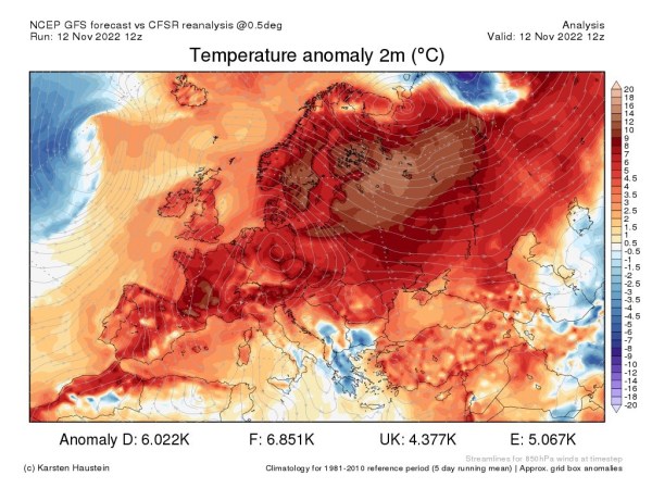 L'Europe le 12.11/2022L'Europe est incroyablement chaudeIl n'a jamais été observé de températures aussi élevées aussi tard dans l'année , dans un grand nombre de régions..