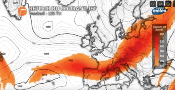 La mise en place d'un puissant courant jet (vent en altitude) va alimenter une rivière atmosphérique qui va déverser beaucoup de pluie sur l'ouest de l'Europe et la France cette semaine.des rafales attendues jeudi.. https://vk.com/video647796984_456245781