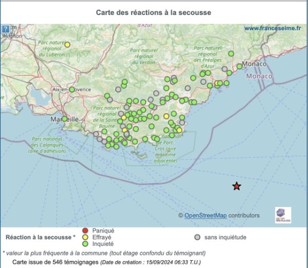 Séisme à 90 km au SSE de Cannes (Dép. 06), le 14 septembre 2024 à 20h47 heure locale, magnitude 4.4. https://vk.com/video647796984_456245768
