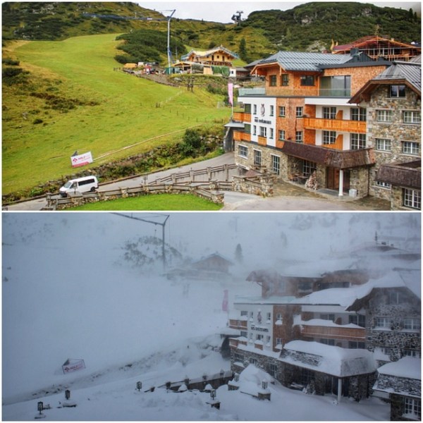 Du jour au lendemain, de l'été à l'hiver…effets de la collision (rencontre de deux tempêtes, dépressions, "cyclones"des cumuls impressionnant…Autriche Obertauern avant et après les chutes de neige