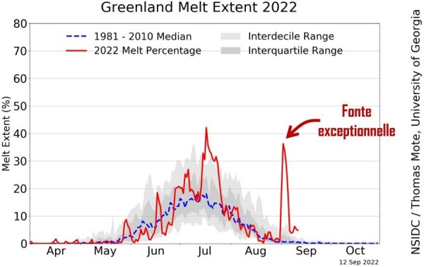Un évènement de fonte exceptionnelle s'est produit au Groenland du 2-5 sept. Cette magnitude est inédite en septembre en 44 ans de mesures satellitaires, relarguant 16,3 milliards de tonnes d'eau à l'océan (en 4 jours).L'anomalie positive des températures était autour des +20°C. La station du sommet au Groenland , à une altitude de plus de... Lire la Suite →
