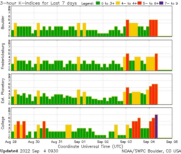 Tempêtes géomagnétique G3 KP 7Un pic en KP7 c'est à dire forte tempête dans le graphique de classification.. avec un KP9 on peut voir les aurores à Marseille..le classement des tempêtes et ses effets en carte.. 4.9/2022 KP63éme tempête géomagnétique ou les aurores descendent dans des latitudes basses..Cela c'est passé le 8 et 18 Août... Lire la Suite →